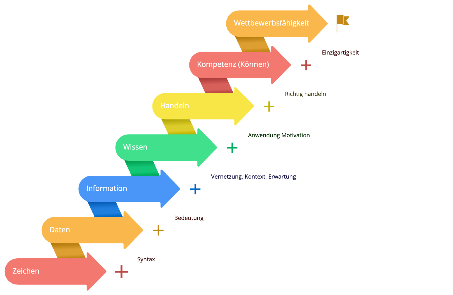 Aus Zeichen werden Daten, führen zu Informationen und erst durch eine gegebene Bedeutung der Information wird es zu Wissen, das in ein Können mündet bis hin zu einem Handeln und schlussendlich zu einer vollumfänglichen Kompetenz.