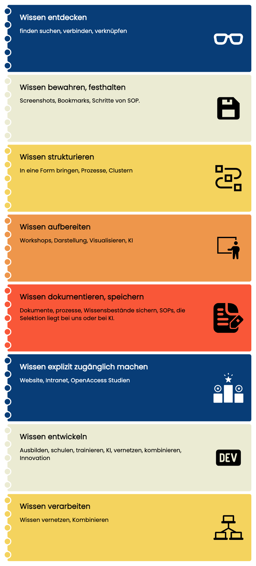 Es erscheint klar, dass nicht eine einzelne Aktivität alleine genügt, um aus vielen Informationen und Daten tatsächlich Wissen zu generieren.