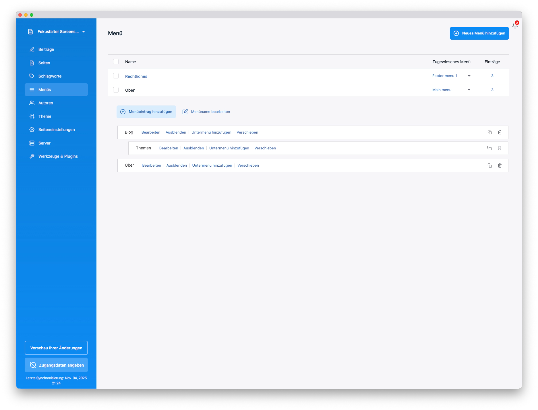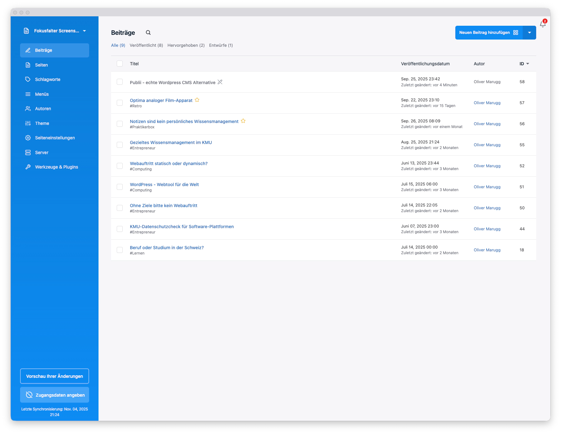 Bei Publii findet auf dem Server keine Pflege von Content, Plugins, Themes oder Tools statt. Alles geschieht lokal in der Desktop-App.
