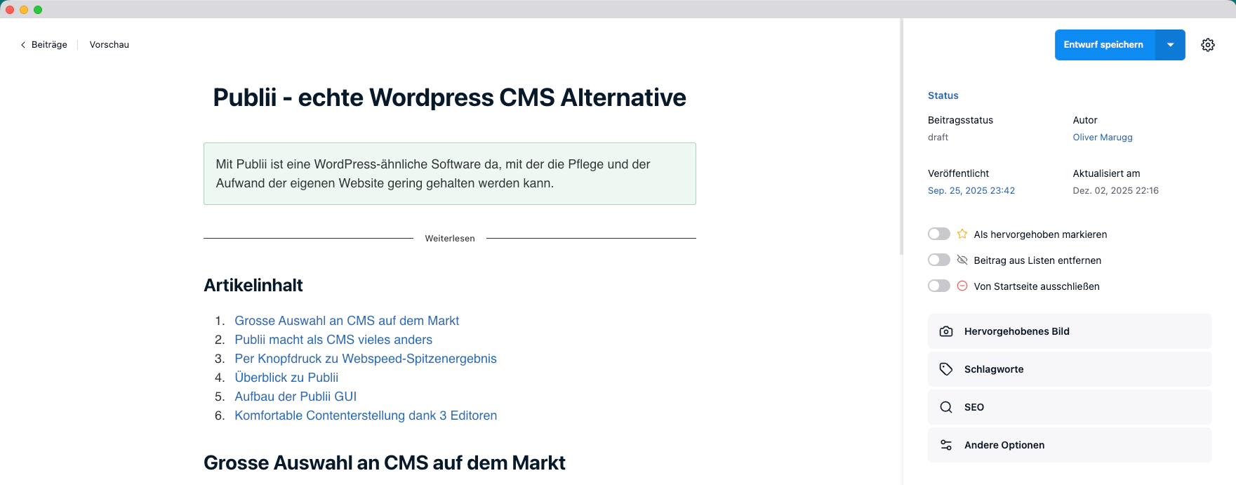 Was Publli speziell macht: Es stehen drei Editoren zur Contenterstellung zur Verfügung. Ein WYSIWYG, ein Blockeditor sowie ein Markdown Editor. Für jeden Beitrag oder Seite kann man je nach Gusto wählen. Hat man für einen Beitrag oder eine Seite den Editor gewählt, lässt sich dieser leider nicht mehr verändern. Das ist schade, würde nach Aussagen der beiden Entwickler jedoch sehr tief und umfassende Revision der Softwarefunktionen bedeuten.