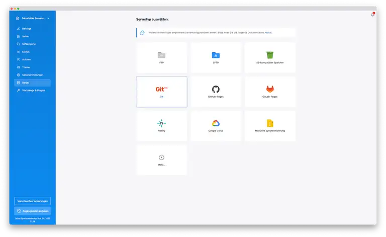 - Server - Upoload der Site via FTP, SFTP, S3, Git, GitHub, Gitlab-pages, Netlify oder Google Cloud oder manuell.