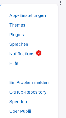 Globale Grundeinstellungen werden im “Drei-Punkte-Menu” (⋮) gesetzt, dort lassen sich App-Sprache, Themes, Plugins, die Mitteilungszentrale und vieles mehr setzen. Die Sprachunterstützung für Deutsch muss separat heruntergeladen und aktiviert werden.